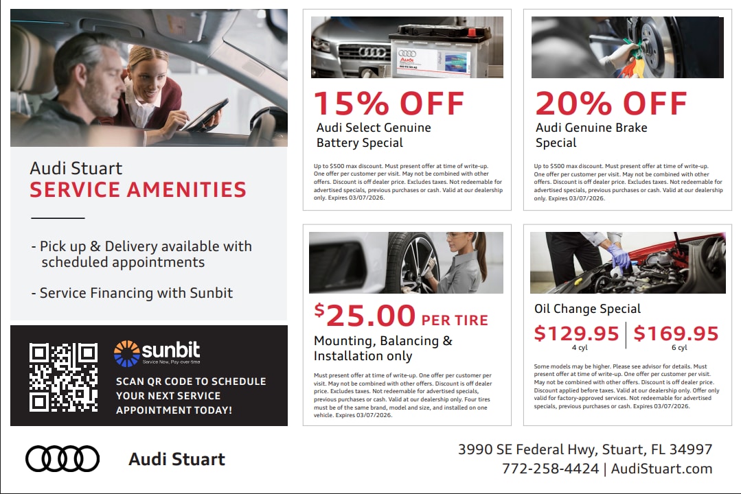 With factory-trained technicians, attention to detail at every step, and a genuine commitment to doing things right the first time, Audi Stuart's service team inspires confidence and builds lasting trust. It's not just about maintaining vehicles-it's about delivering peace of mind and an experience worthy of the Audi name.